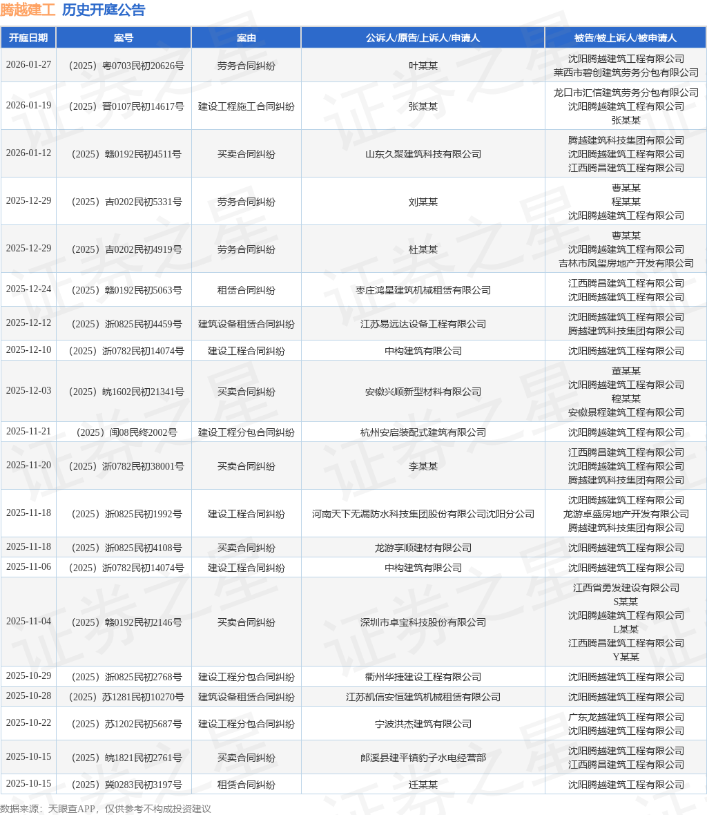 案号:(2025)浙0825民初4459号根据统计,近一年内以沈阳腾越建筑工程有限公司为当事人的历史开庭公告有334则,其中案由为“买卖合同纠纷”的公告以78则居首,其次为“建设工程施工合同纠纷”有77则,“建设工程分包合同纠纷”有40则。历史开庭公告(前20条)如下: