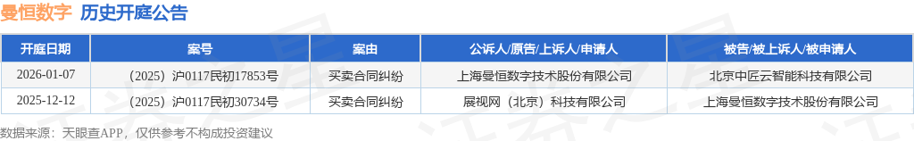 根据统计,近一年内以上海曼恒数字技术股份有限公司为当事人的历史开庭公告有2则,其中案由为“买卖合同纠纷”的公告以2则居首。历史开庭公告如下: