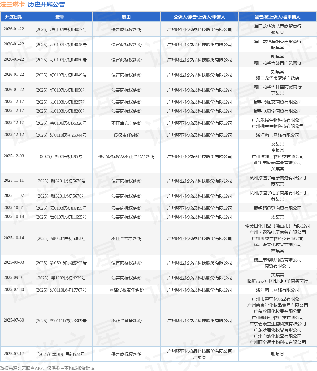 案号:(2025)浙0110民初25944号根据统计,近一年内以广州环亚化妆品科技股份有限公司为当事人的历史开庭公告有72则,其中案由为“侵害商标权纠纷”的公告以46则居首,其次为“不正当竞争纠纷”有19则,“劳动争议”有2则。历史开庭公告(前20条)如下: