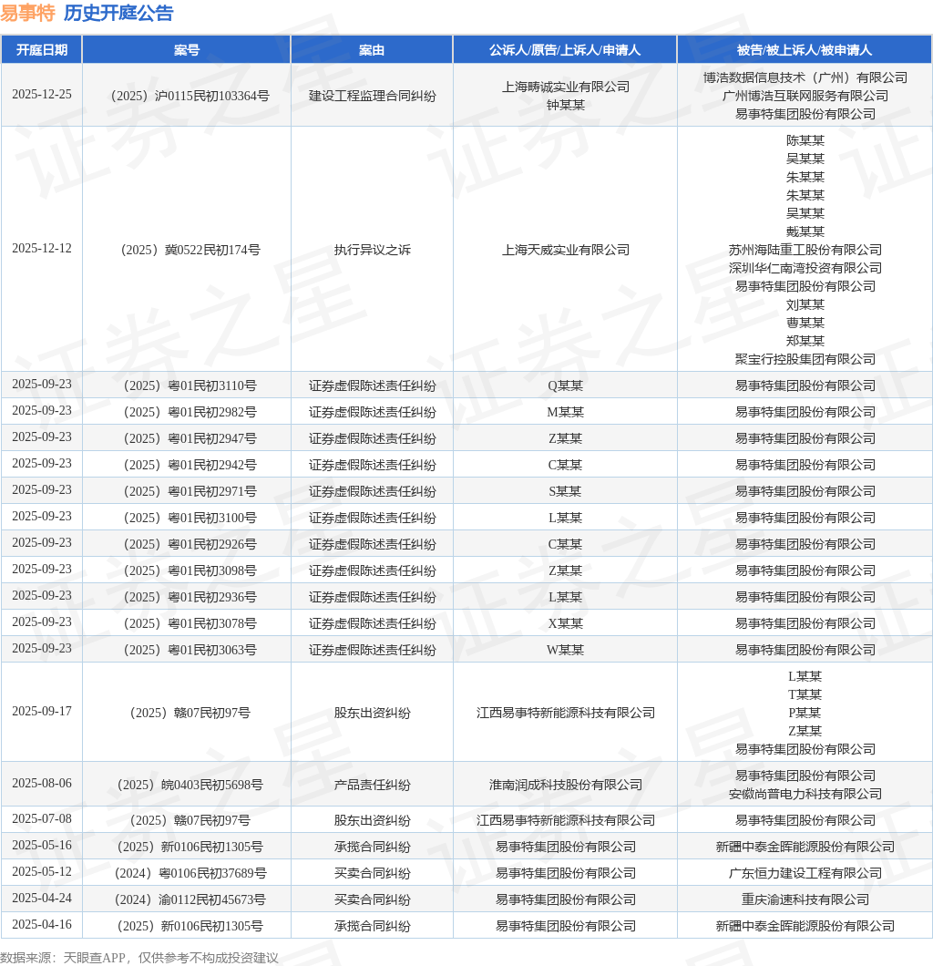 案号:(2025)冀0522民初174号根据统计,近一年内以易事特集团股份有限公司为当事人的历史开庭公告有24则,其中案由为“证券虚假陈述责任纠纷”的公告以12则居首,其次为“买卖合同纠纷”有3则,“承揽合同纠纷”有2则。历史开庭公告(前20条)如下: