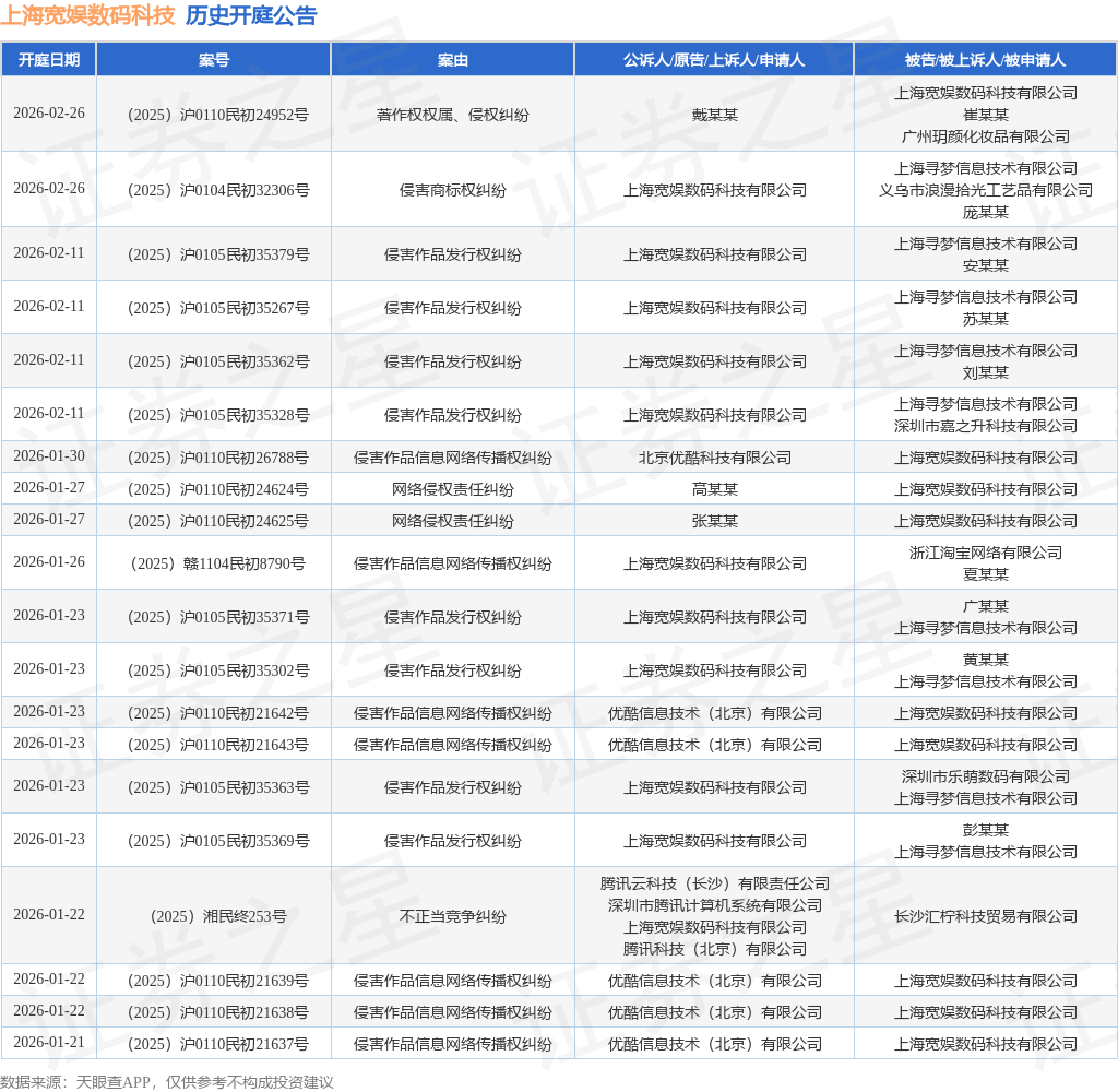 案号:(2025)沪0110民初23117号根据统计,近一年内以上海宽娱数码科技有限公司为当事人的历史开庭公告有743则,其中案由为“侵害作品信息网络传播权纠纷”的公告以388则居首,其次为“著作权权属、侵权纠纷”有147则,“网络侵权责任纠纷”有58则。历史开庭公告(前20条)如下: