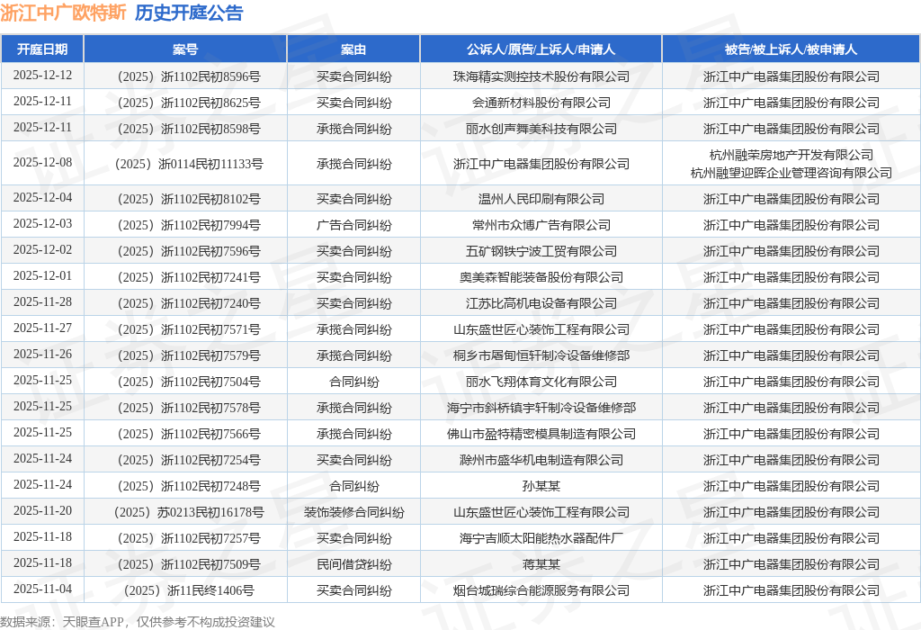案号:(2025)浙1102民初8596号根据统计,近一年内以浙江中广电器集团股份有限公司为当事人的历史开庭公告有45则,其中案由为“买卖合同纠纷”的公告以20则居首,其次为“承揽合同纠纷”有17则,“合同纠纷”有3则。历史开庭公告(前20条)如下: