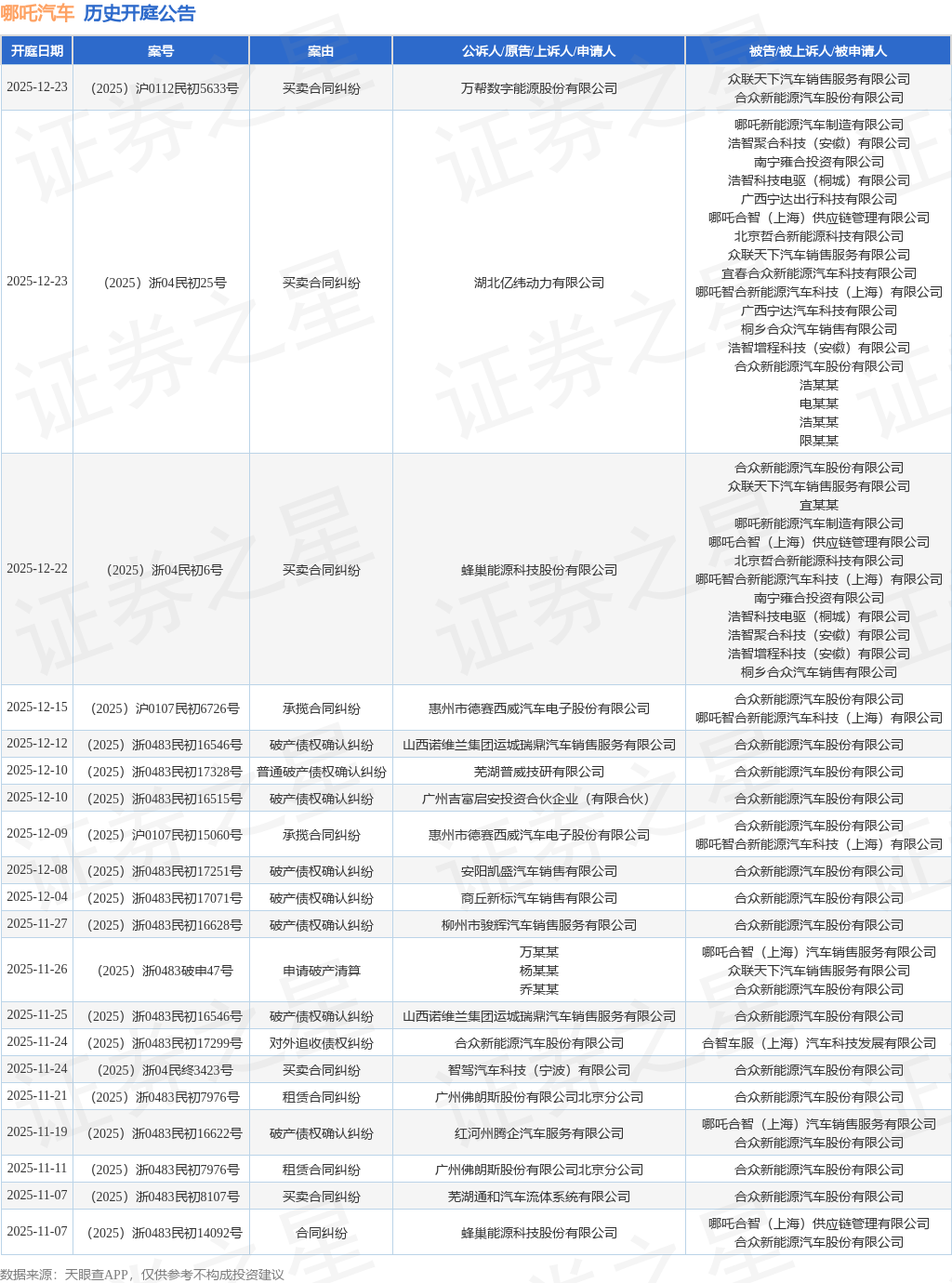 案号:(2025)浙0483民初16546号根据统计,近一年内以合众新能源汽车股份有限公司为当事人的历史开庭公告有404则,其中案由为“买卖合同纠纷”的公告以157则居首,其次为“服务合同纠纷”有51则,“合同纠纷”有49则。历史开庭公告(前20条)如下: