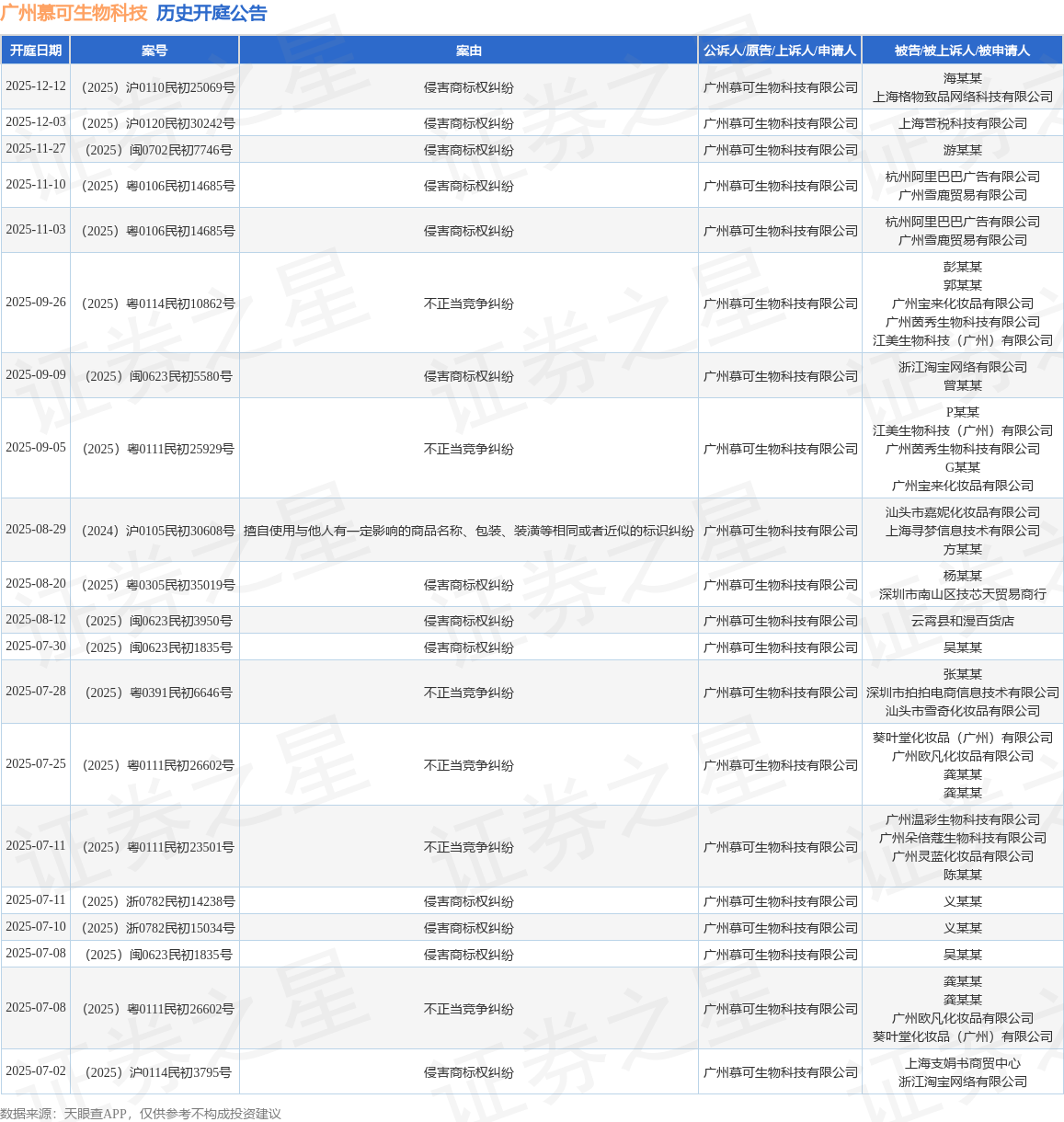 案号:(2025)沪0110民初25069号根据统计,近一年内以广州慕可生物科技有限公司为当事人的历史开庭公告有109则,其中案由为“侵害商标权纠纷”的公告以51则居首,其次为“不正当竞争纠纷”有21则,“劳动争议”有9则。历史开庭公告(前20条)如下: