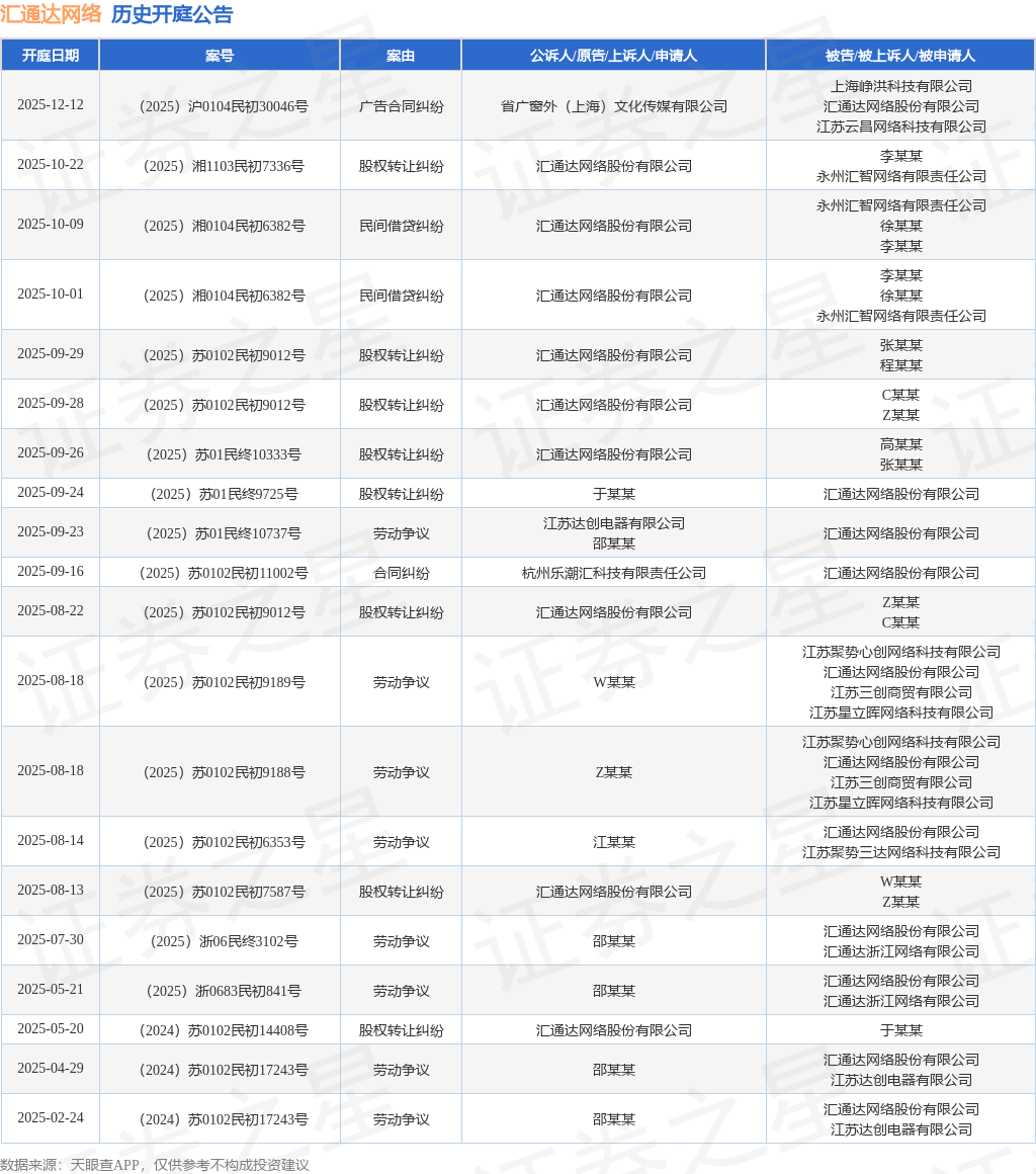 案号:(2025)沪0104民初30046号根据统计,近一年内以汇通达网络股份有限公司为当事人的历史开庭公告有27则,其中案由为“劳动争议”的公告以11则居首,其次为“股权转让纠纷”有11则,“民间借贷纠纷”有2则。历史开庭公告(前20条)如下: