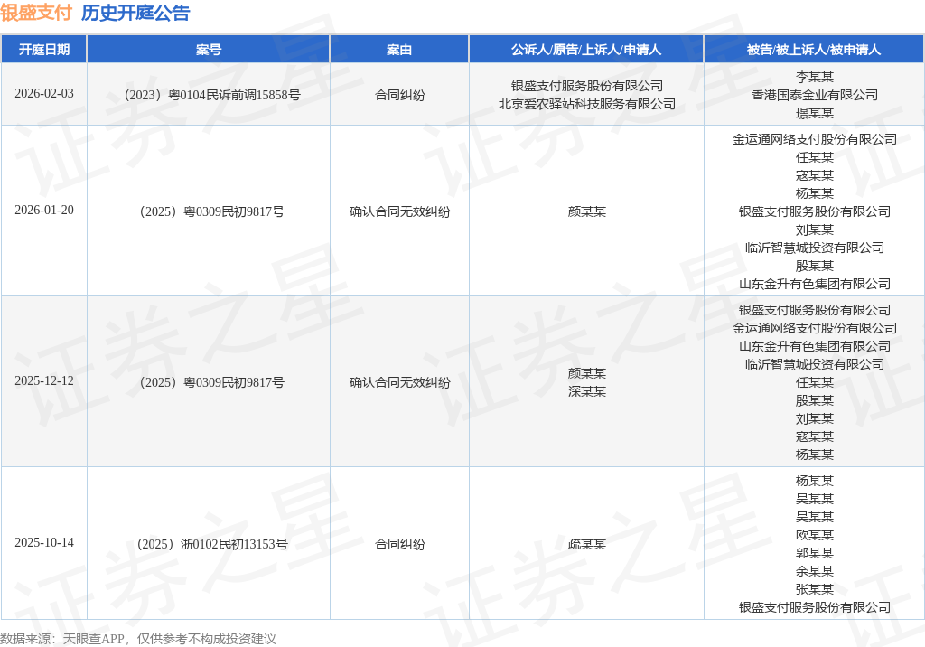 根据统计,近一年内以银盛支付服务股份有限公司为当事人的历史开庭公告有4则,其中案由为“合同纠纷”的公告以2则居首,其次为“确认合同无效纠纷”有2则。历史开庭公告如下: