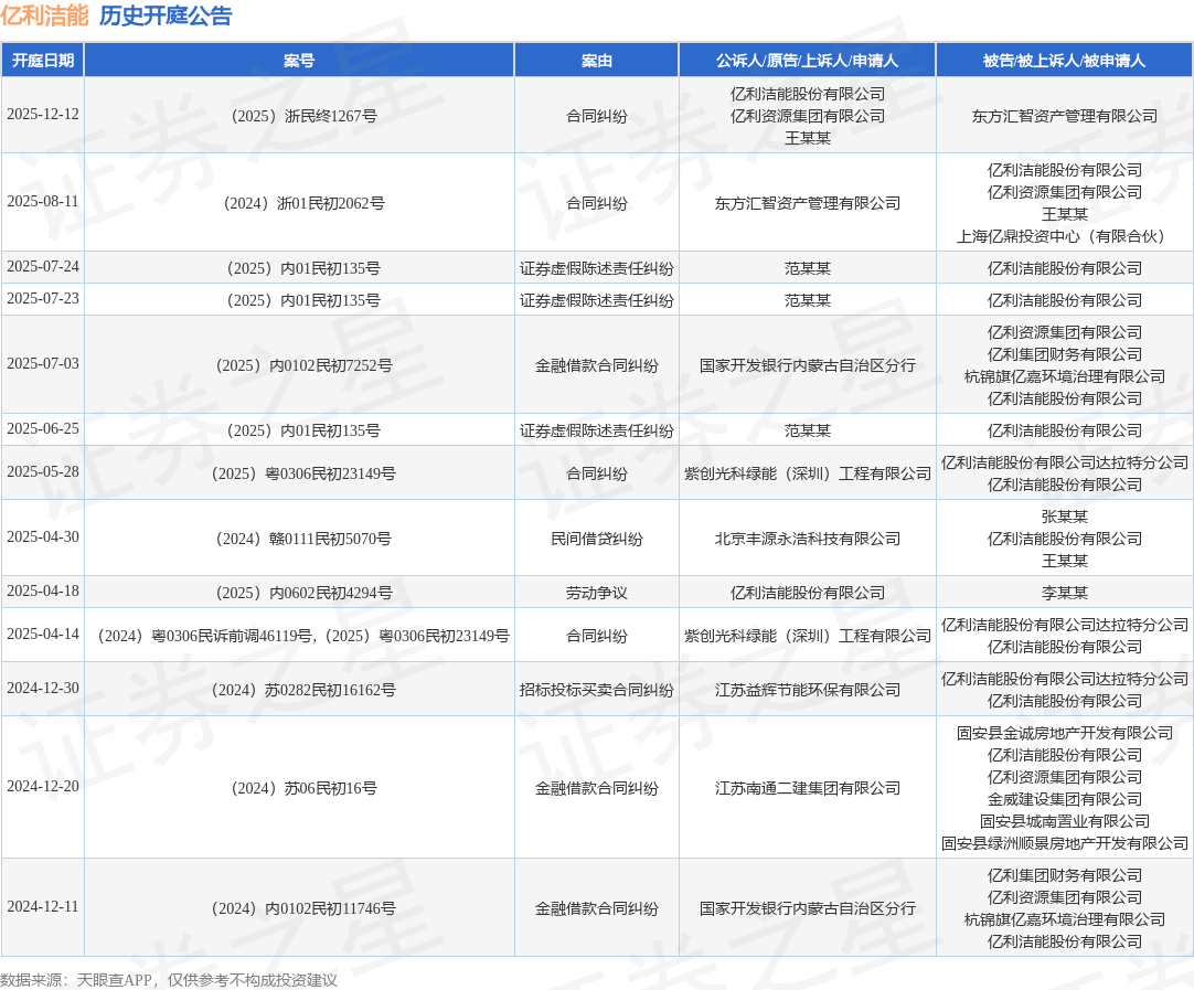 根据统计,近一年内以亿利洁能股份有限公司为当事人的历史开庭公告有13则,其中案由为“合同纠纷”的公告以4则居首,其次为“证券虚假陈述责任纠纷”有3则,“金融借款合同纠纷”有3则。历史开庭公告如下: