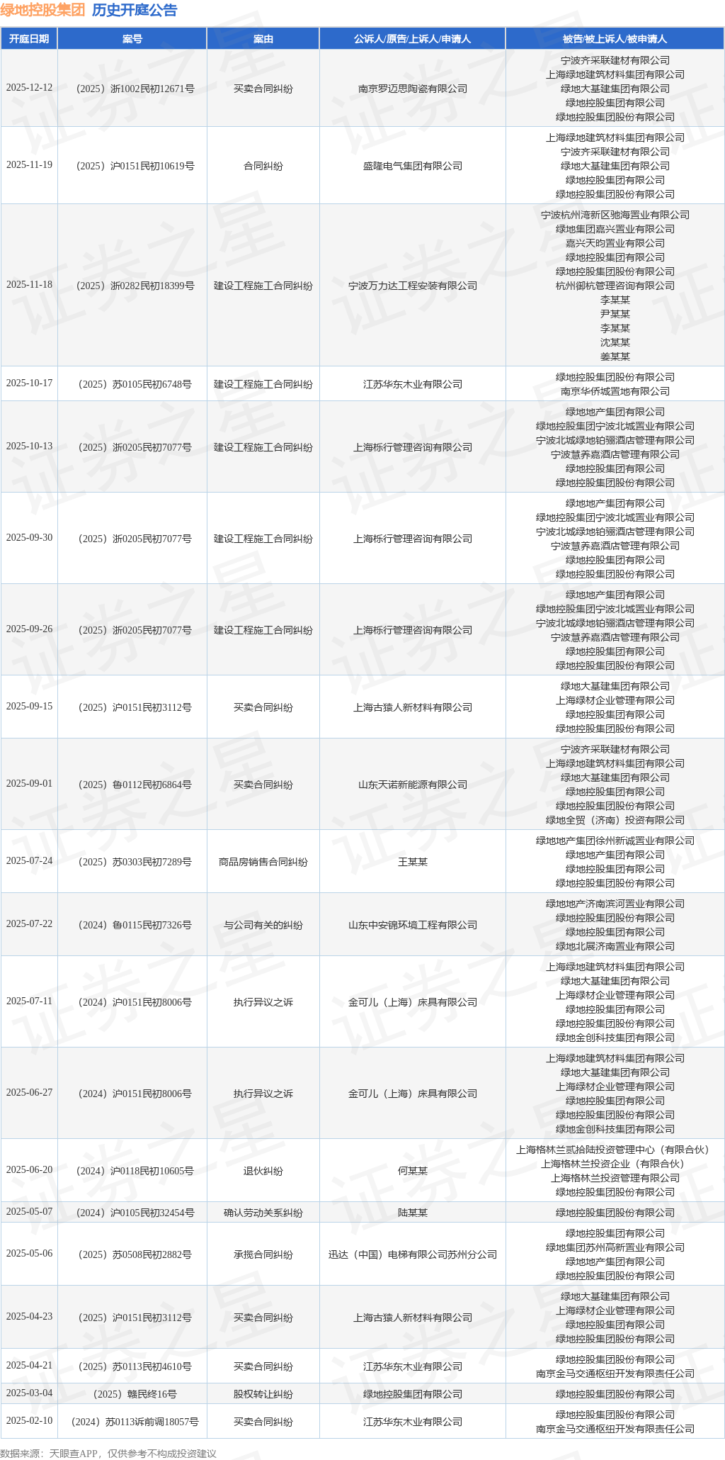 案号:(2025)浙1002民初12671号根据统计,近一年内以绿地控股集团股份有限公司为当事人的历史开庭公告有24则,其中案由为“买卖合同纠纷”的公告以8则居首,其次为“建设工程施工合同纠纷”有5则,“执行异议之诉”有3则。历史开庭公告(前20条)如下: