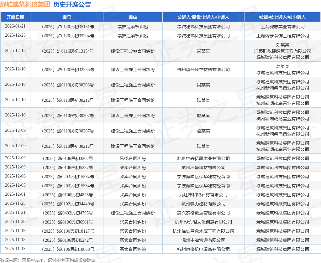 案号:(2025)沪0116民初13154号根据统计,近一年内以绿城建筑科技集团有限公司为当事人的历史开庭公告有21则,其中案由为“买卖合同纠纷”的公告以10则居首,其次为“建设工程施工合同纠纷”有7则,“票据追索权纠纷”有2则。历史开庭公告(前20条)如下: