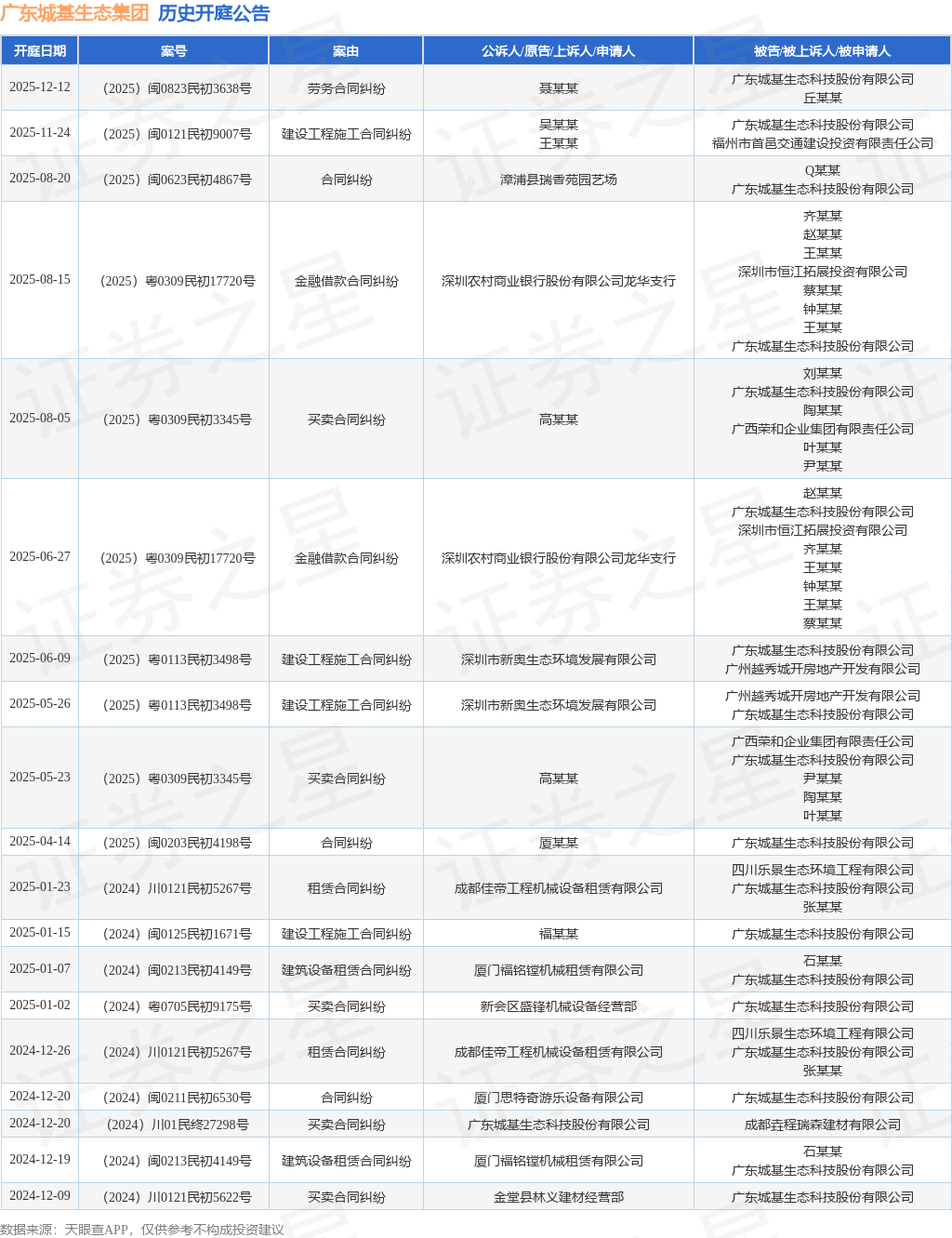 案号:(2025)闽0823民初3638号根据统计,近一年内以广东城基生态科技股份有限公司为当事人的历史开庭公告有19则,其中案由为“买卖合同纠纷”的公告以5则居首,其次为“建设工程施工合同纠纷”有4则,“合同纠纷”有3则。历史开庭公告如下: