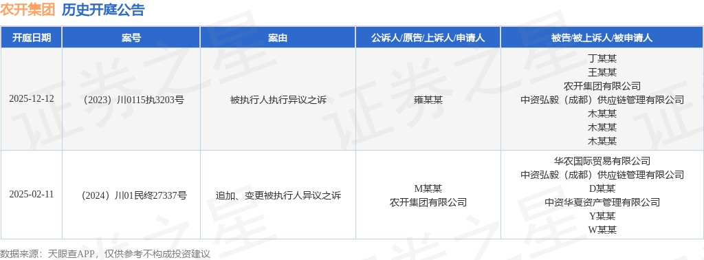 根据统计,近一年内以农开集团有限公司为当事人的历史开庭公告有2则,其中案由为“被执行人执行异议之诉”的公告以1则居首,其次为“追加、变更被执行人异议之诉”有1则。历史开庭公告如下: