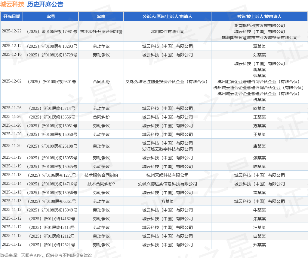 案号:(2025)浙0108民初13293号根据统计,近一年内以城云科技(中国)有限公司为当事人的历史开庭公告有176则,其中案由为“劳动争议”的公告以103则居首,其次为“合同纠纷”有24则,“服务合同纠纷”有11则。历史开庭公告(前20条)如下: