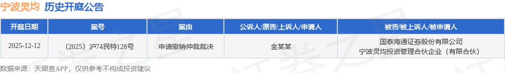 根据统计,近一年内以宁波灵均投资管理合伙企业(有限合伙)为当事人的历史开庭公告有1则,其中案由为“申请撤销仲裁裁决”的公告以1则居首。历史开庭公告如下: