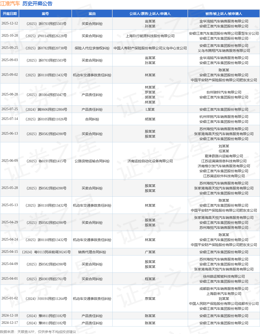 案号:(2025)浙0703民初5503号根据统计,近一年内以安徽江淮汽车集团股份有限公司为当事人的历史开庭公告有23则,其中案由为“买卖合同纠纷”的公告以9则居首,其次为“产品责任纠纷”有6则,“机动车交通事故责任纠纷”有4则。历史开庭公告(前20条)如下: