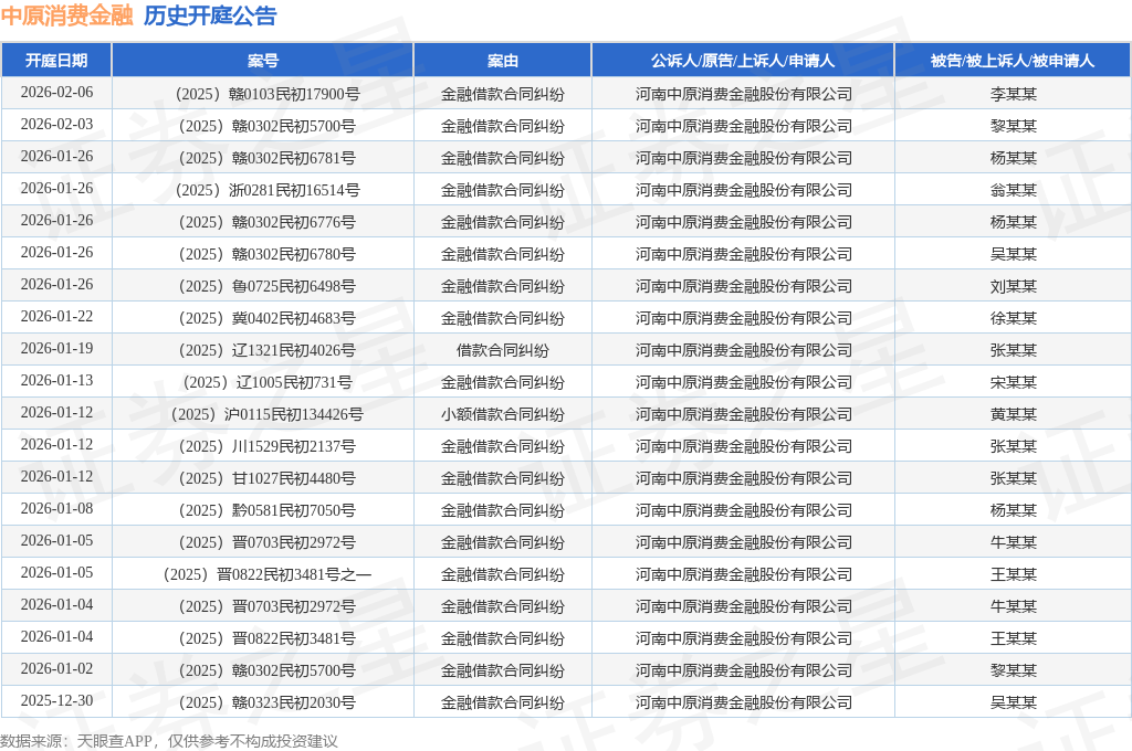 案号:(2025)闽0627民初3209号根据统计,近一年内以河南中原消费金融股份有限公司为当事人的历史开庭公告有1564则,其中案由为“金融借款合同纠纷”的公告以907则居首,其次为“借款合同纠纷”有424则,“小额借款合同纠纷”有111则。历史开庭公告(前20条)如下: