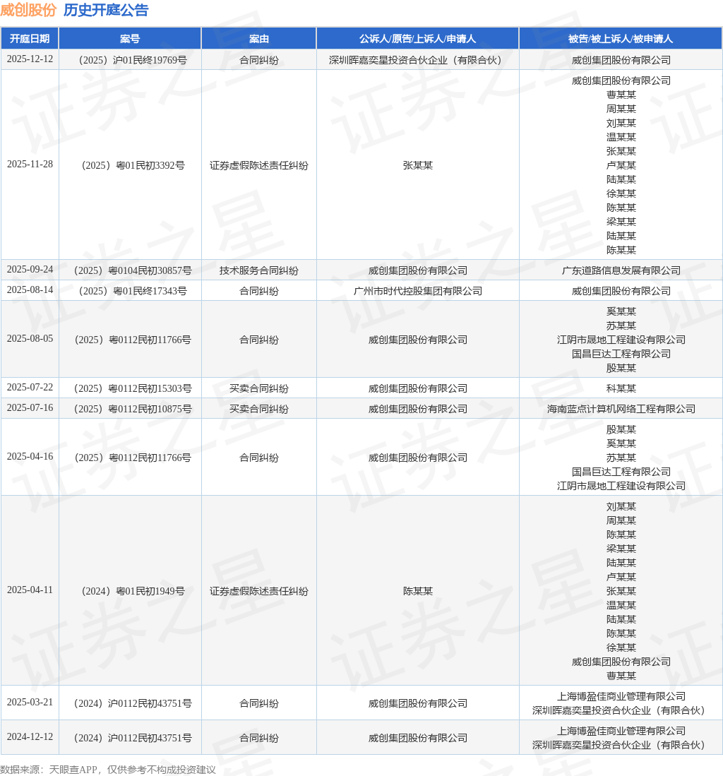 根据统计,近一年内以威创集团股份有限公司为当事人的历史开庭公告有11则,其中案由为“合同纠纷”的公告以6则居首,其次为“买卖合同纠纷”有2则,“证券虚假陈述责任纠纷”有2则。历史开庭公告如下: