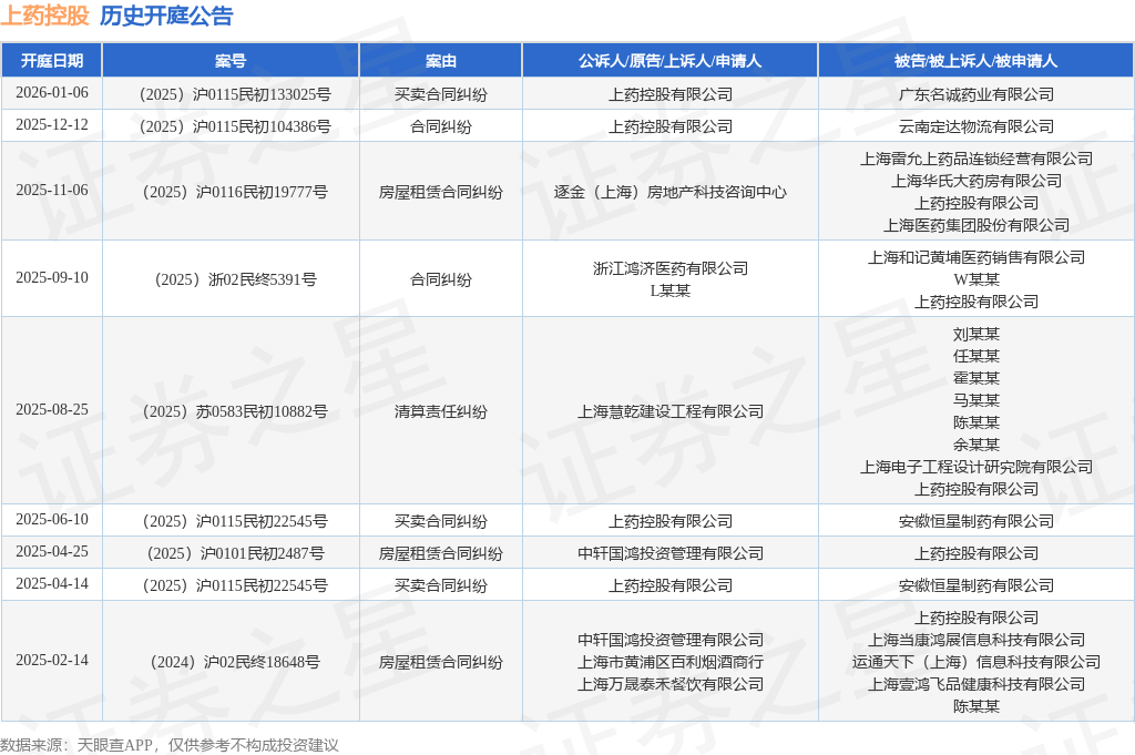 根据统计,近一年内以上药控股有限公司为当事人的历史开庭公告有9则,其中案由为“买卖合同纠纷”的公告以3则居首,其次为“房屋租赁合同纠纷”有3则,“合同纠纷”有2则。历史开庭公告如下: