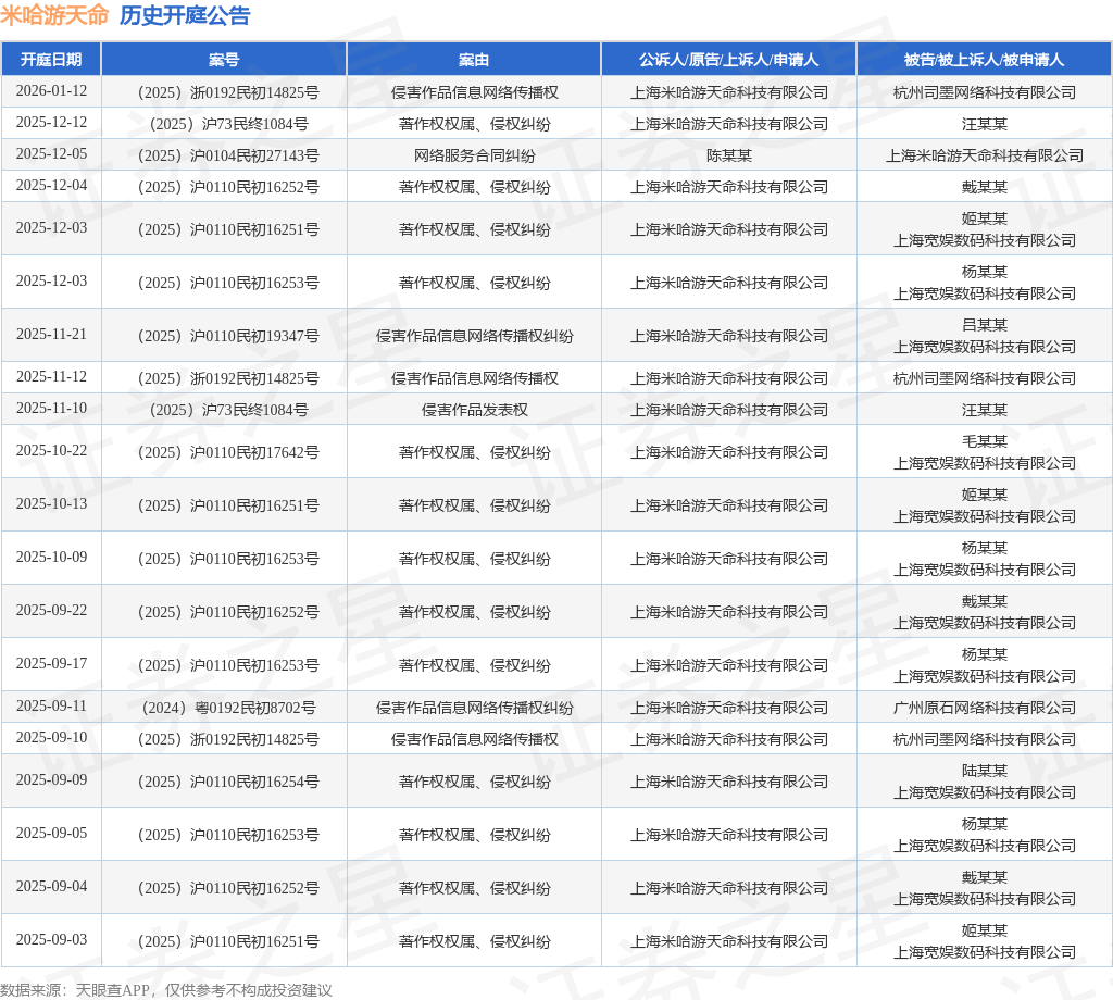 案号:(2025)沪73民终1084号根据统计,近一年内以上海米哈游天命科技有限公司为当事人的历史开庭公告有87则,其中案由为“著作权权属、侵权纠纷”的公告以44则居首,其次为“侵害作品信息网络传播权纠纷”有9则,“侵害作品发行权纠纷”有6则。历史开庭公告(前20条)如下: