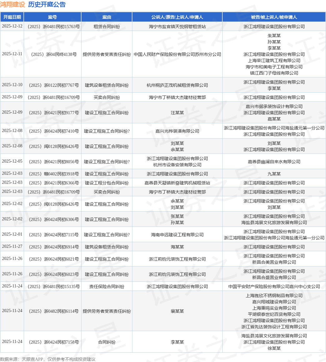 案号:(2025)浙0481民初15763号根据统计,近一年内以浙江鸿翔建设集团股份有限公司为当事人的历史开庭公告有218则,其中案由为“建设工程施工合同纠纷”的公告以47则居首,其次为“买卖合同纠纷”有33则,“建设工程分包合同纠纷”有27则。历史开庭公告(前20条)如下: