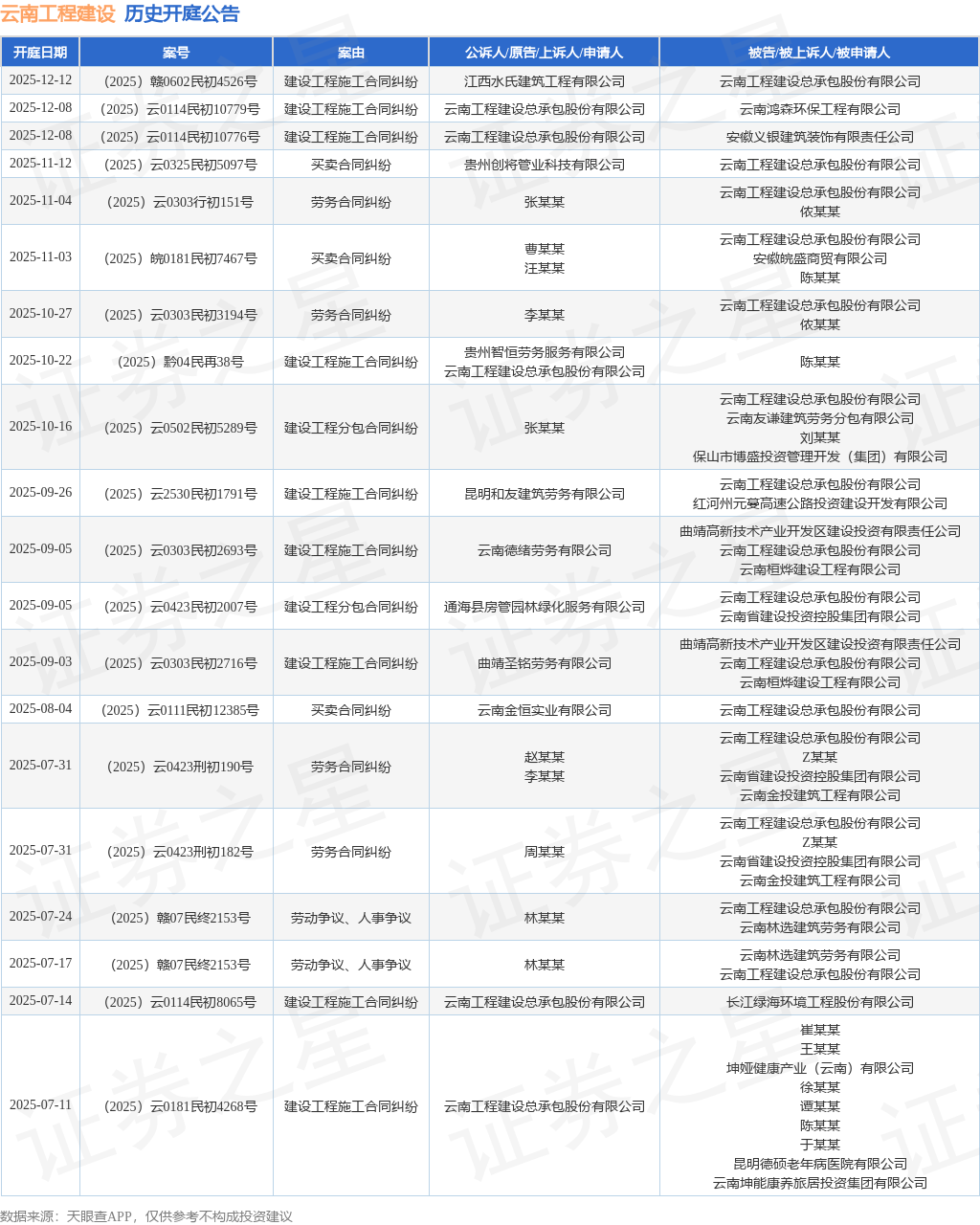 案号:(2025)赣0602民初4526号根据统计,近一年内以云南工程建设总承包股份有限公司为当事人的历史开庭公告有63则,其中案由为“建设工程施工合同纠纷”的公告以29则居首,其次为“买卖合同纠纷”有11则,“劳务合同纠纷”有9则。历史开庭公告(前20条)如下: