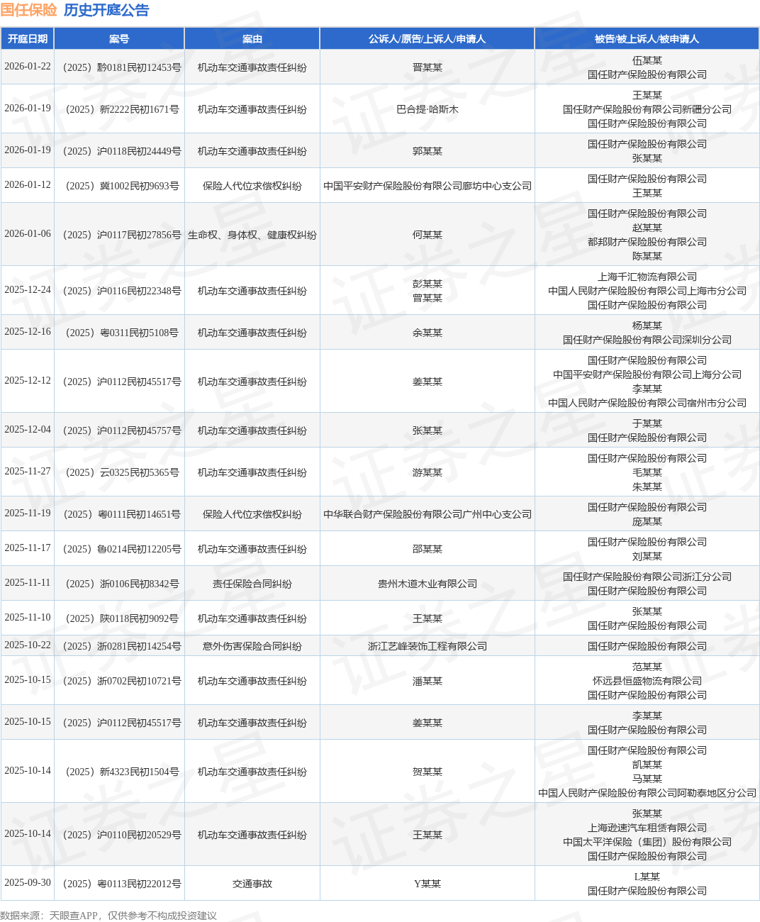 案号:(2025)沪0112民初45517号根据统计,近一年内以国任财产保险股份有限公司为当事人的历史开庭公告有185则,其中案由为“机动车交通事故责任纠纷”的公告以101则居首,其次为“保险人代位求偿权纠纷”有20则,“交通事故”有18则。历史开庭公告(前20条)如下: