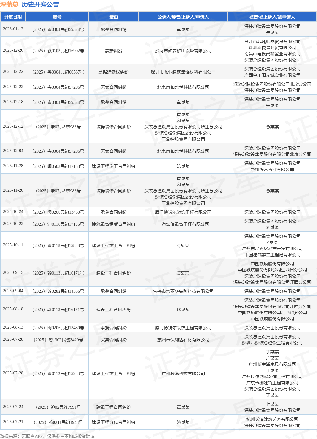案号:(2025)浙07民终5983号根据统计,近一年内以深装总建设集团股份有限公司为当事人的历史开庭公告有81则,其中案由为“建设工程合同纠纷”的公告以12则居首,其次为“买卖合同纠纷”有11则,“建设工程施工合同纠纷”有10则。历史开庭公告(前20条)如下: