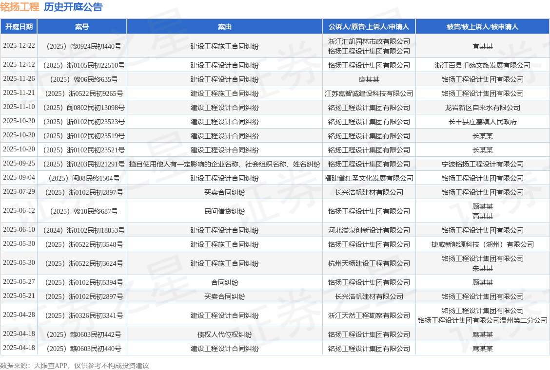 案号:(2025)浙0105民初22510号根据统计,近一年内以铭扬工程设计集团有限公司为当事人的历史开庭公告有24则,其中案由为“建设工程设计合同纠纷”的公告以11则居首,其次为“建设工程施工合同纠纷”有6则,“买卖合同纠纷”有2则。历史开庭公告(前20条)如下: