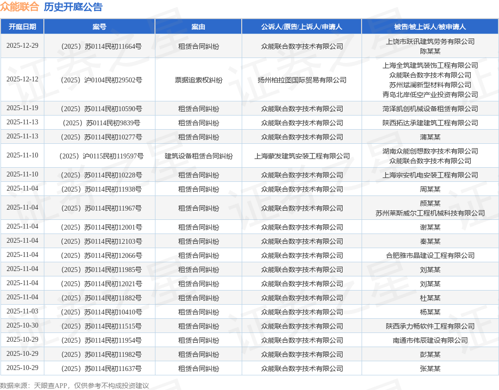 案号:(2025)沪0104民初29502号根据统计,近一年内以众能联合数字技术有限公司为当事人的历史开庭公告有525则,其中案由为“租赁合同纠纷”的公告以498则居首,其次为“追偿权纠纷”有10则,“机动车交通事故责任纠纷”有5则。历史开庭公告(前20条)如下: