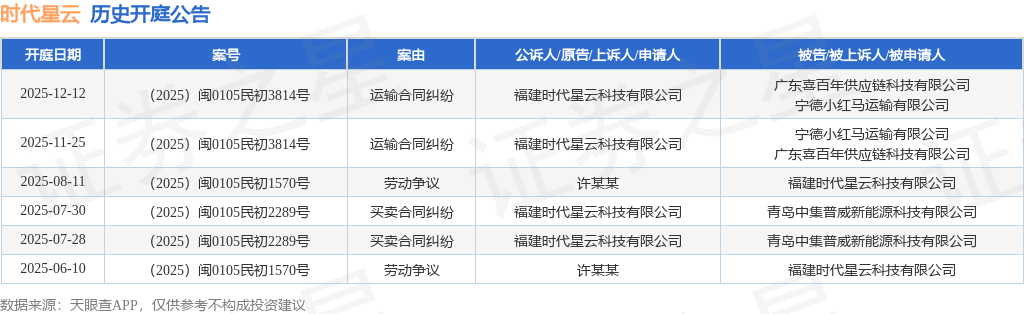 根据统计,近一年内以福建时代星云科技有限公司为当事人的历史开庭公告有6则,其中案由为“买卖合同纠纷”的公告以2则居首,其次为“劳动争议”有2则,“运输合同纠纷”有2则。历史开庭公告如下: