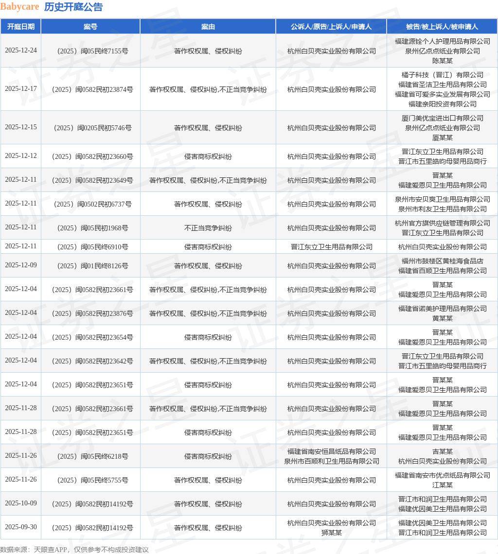 案号:(2025)闽0582民初23660号根据统计,近一年内以杭州白贝壳实业股份有限公司为当事人的历史开庭公告有70则,其中案由为“侵害商标权纠纷”的公告以23则居首,其次为“著作权权属、侵权纠纷”有21则,“著作权权属、侵权纠纷,不正当竞争纠纷”有6则。历史开庭公告(前20条)如下: