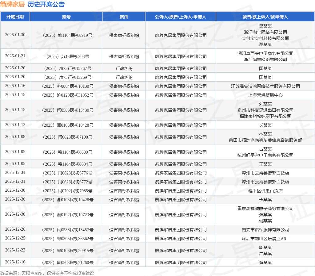 案号:(2025)赣1104民初7186号根据统计,近一年内以箭牌家居集团股份有限公司为当事人的历史开庭公告有482则,其中案由为“侵害商标权纠纷”的公告以423则居首,其次为“商标权权属、侵权纠纷”有16则,“行政纠纷”有8则。历史开庭公告(前20条)如下: