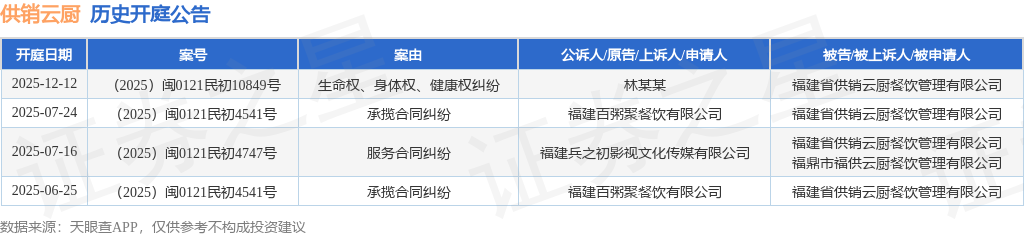 案号:(2025)闽0121民初10849号根据统计,近一年内以福建省供销云厨餐饮管理有限公司为当事人的历史开庭公告有4则,其中案由为“承揽合同纠纷”的公告以2则居首,其次为“服务合同纠纷”有1则,“生命权、身体权、健康权纠纷”有1则。历史开庭公告如下: