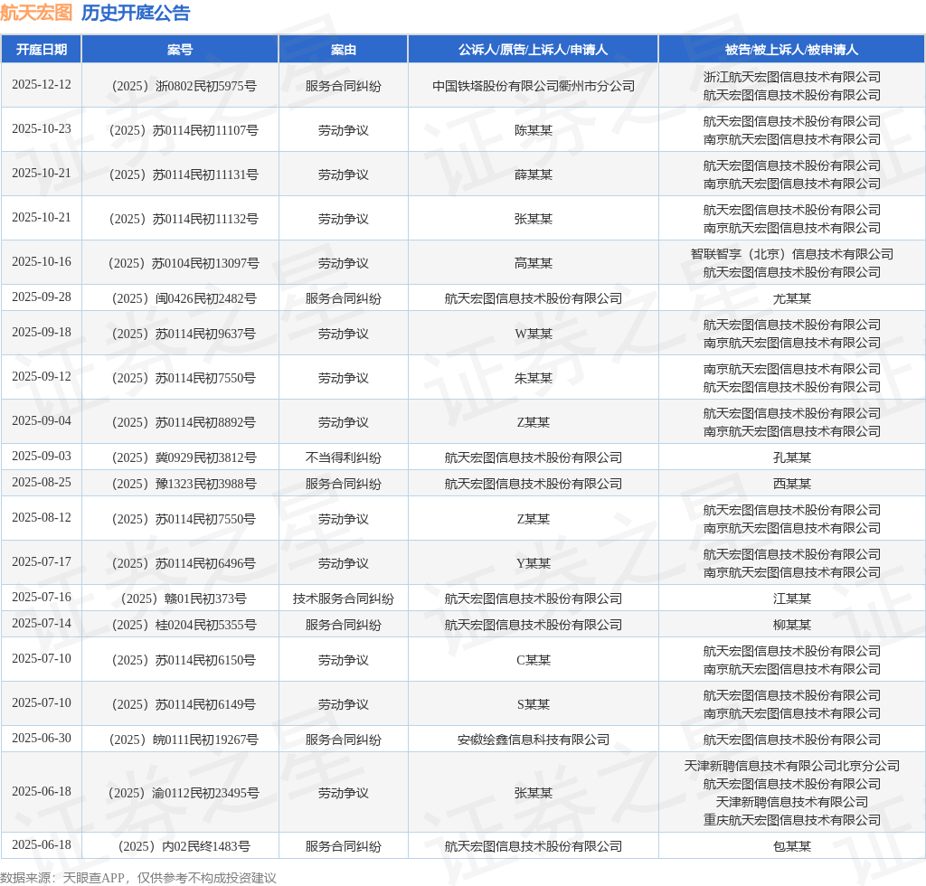 案号:(2025)浙0802民初5975号根据统计,近一年内以航天宏图信息技术股份有限公司为当事人的历史开庭公告有27则,其中案由为“劳动争议”的公告以12则居首,其次为“服务合同纠纷”有9则,“买卖合同纠纷”有2则。历史开庭公告(前20条)如下: