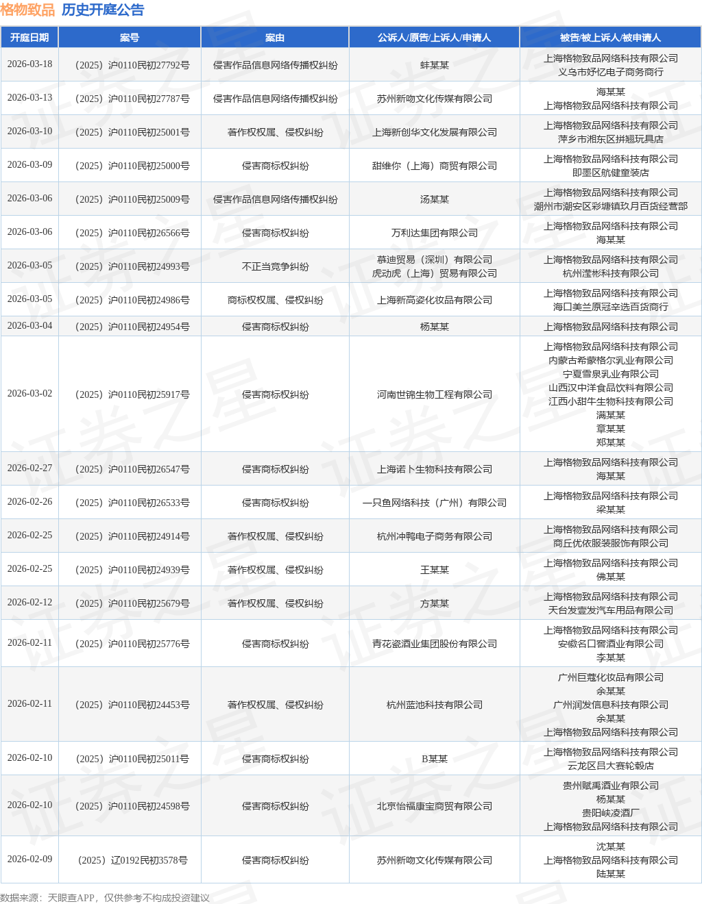 案号:(2025)沪0110民初24630号根据统计,近一年内以上海格物致品网络科技有限公司为当事人的历史开庭公告有3425则,其中案由为“侵害外观设计专利权纠纷”的公告以805则居首,其次为“侵害商标权纠纷”有692则,“著作权权属、侵权纠纷”有529则。历史开庭公告(前20条)如下: