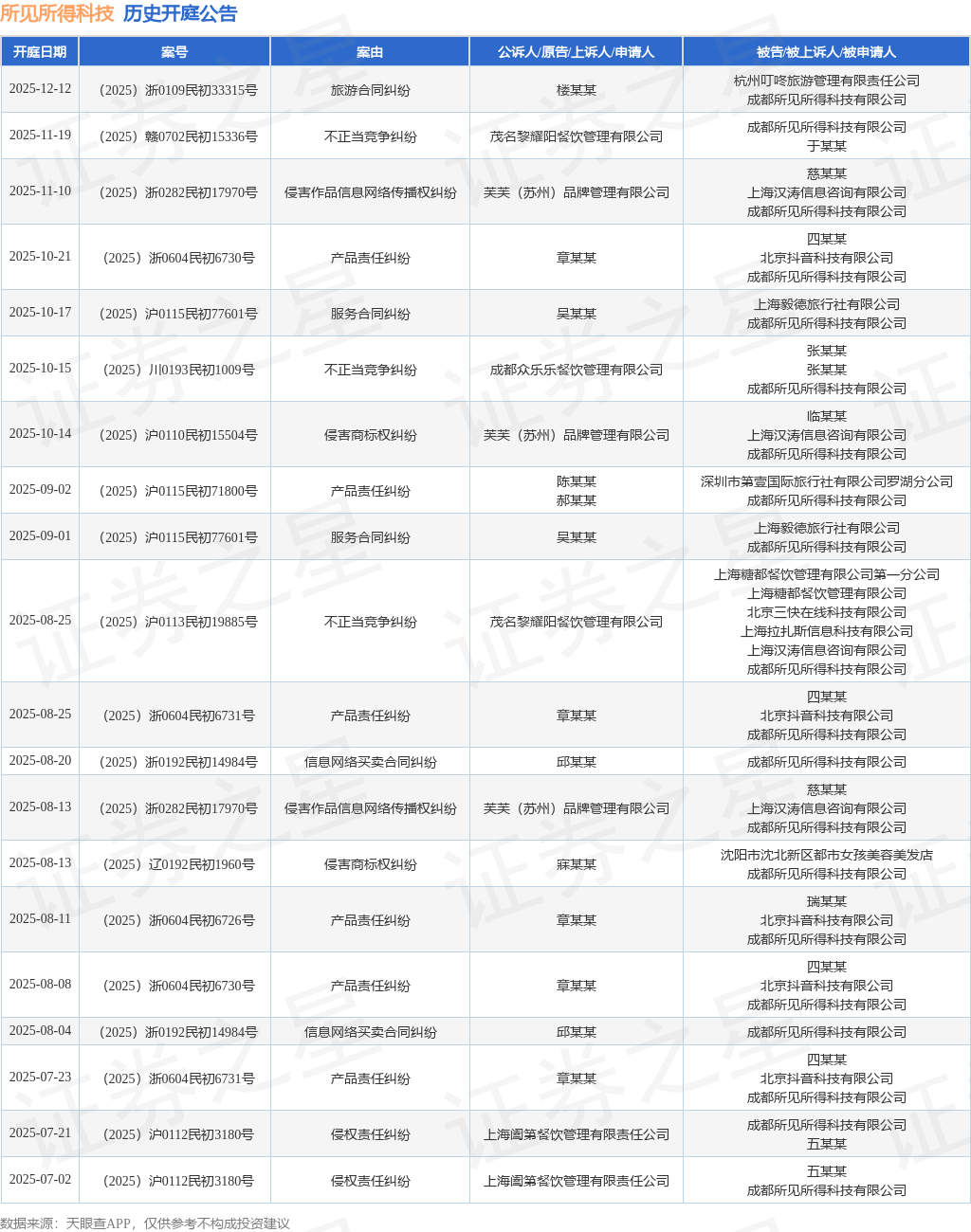 案号:(2025)浙0109民初33315号根据统计,近一年内以成都所见所得科技有限公司为当事人的历史开庭公告有49则,其中案由为“侵害外观设计专利权纠纷”的公告以8则居首,其次为“侵害商标权纠纷”有7则,“产品责任纠纷”有6则。历史开庭公告(前20条)如下: