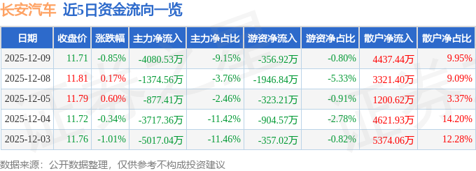 证券之星消息,截至2025年12月9日收盘,长安汽车(000625)报收于11.71元,下跌0.85%,换手率0.46%,成交量38.01万手,成交额4.46亿元。