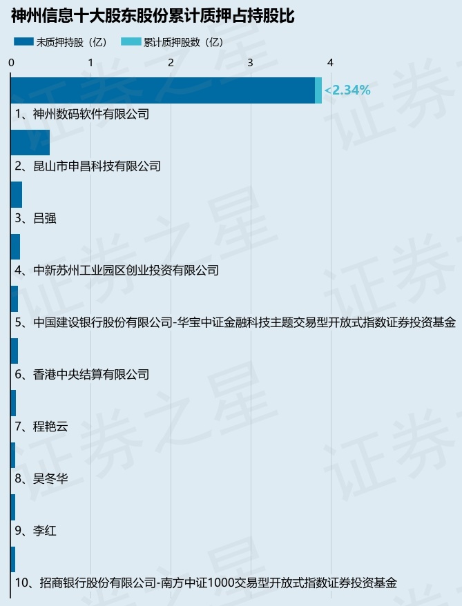 截止本公告日,股东神州数码软件有限公司已累计质押股份910.0万股,占其持股总数的2.34%。本次质押后神州信息十大股东的累计质押股份占持股比例(占持股比例的计算以公司最新一期财务报表公布的十大股东的持股总数为基准)见下图: