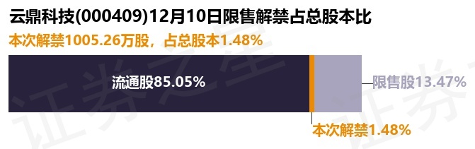 证券之星消息,根据市场公开信息整理,云鼎科技(000409)于12月10日将有1005.26万股限售股份解禁,为公司定向增发机构配售股份,占公司总股本1.48%。(本次数据根据历史公告整理得出,实际情况以上市公司最新公告为准)最近一年内,该股累计解禁1.53亿股,占总股本的22.61%。本次解禁后,公司还有9131.53万股限售股份,占总股本13.47%。具体如下图所示: