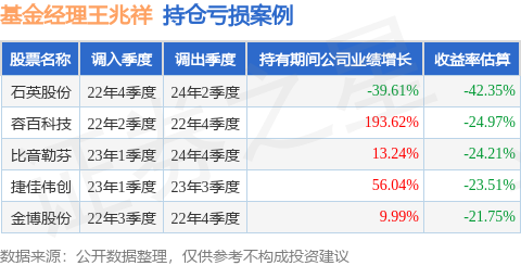 王兆祥管理的国泰估值LOF基金在22年4季度买入石英股份,在持有1年又2个季度后在24年2季度卖出。持有期间的估算收益率为-42.35%,持有期间石英股份在2022年到2024年的年报营业总收入降幅为39.61%。