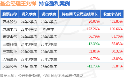王兆祥管理的国泰估值LOF基金在24年2季度买入双林股份,在持有1年又1个季度后在25年3季度卖出。持有期间的估算收益率为455.85%,持有期间双林股份在2024年到2025年的中报营业总收入增幅达20.07%。