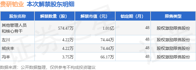 证券之星消息,根据市场公开信息整理,贵研铂业(600459)于12月10日将有586.67万股限售股份解禁,为公司股权激励限售股份,占公司总股本0.77%。(本次数据根据历史公告整理得出,实际情况以上市公司最新公告为准)最近一年内,该股累计解禁613.19万股,占总股本的0.81%。本次解禁后,公司还有10.09万股限售股份,占总股本0.01%。具体如下图所示: