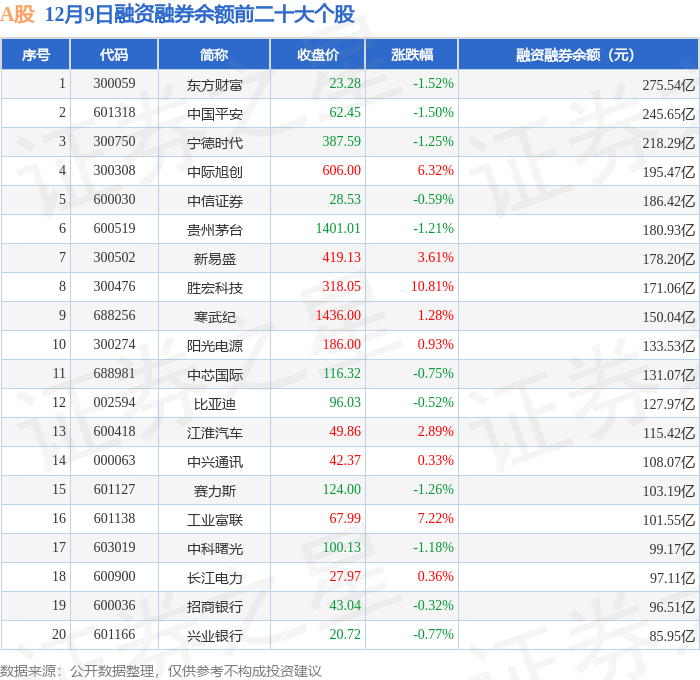 A股融资融券余额前三分别为:东方财富(300059)融资融券余额275.54亿元、中国平安(601318)融资融券余额245.65亿元、宁德时代(300750)融资融券余额218.29亿元,前20具体见下表: