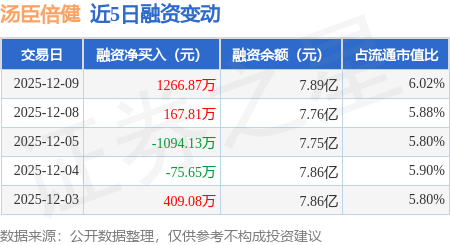 证券之星消息,12月9日,汤臣倍健(300146)融资买入2881.85万元,融资偿还1614.98万元,融资净买入1266.87万元,融资余额7.89亿元,近20个交易日中有13个交易日出现融资净买入。