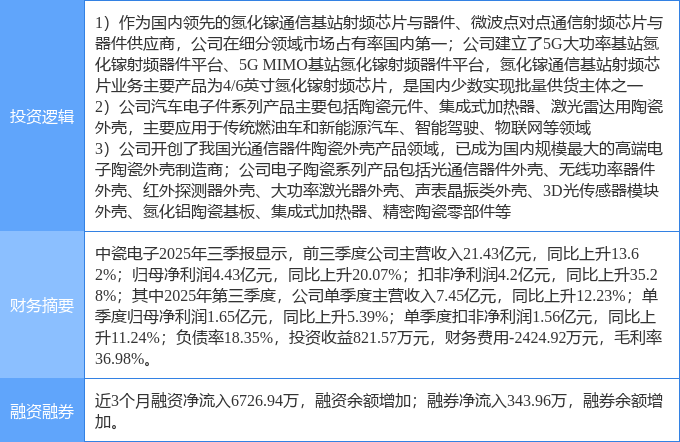 证券之星消息,中瓷电子12月10日涨停收盘,收盘价71.84元。该股于9点40分涨停,23次打开涨停,截止收盘封单资金为1594.56万元,占其流通市值0.07%。