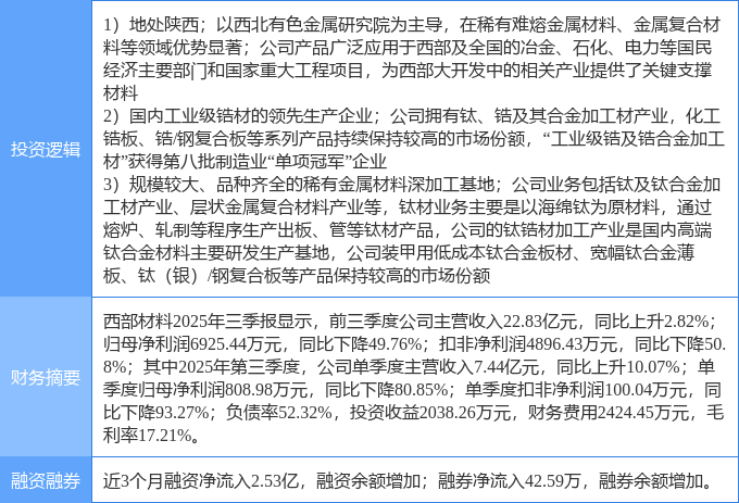 该股为有色 · 锆,西部大开发,有色 · 钛概念热股,当日有色 · 锆概念上涨1.95%,西部大开发概念上涨0.72%,有色 · 钛概念上涨0.52%。