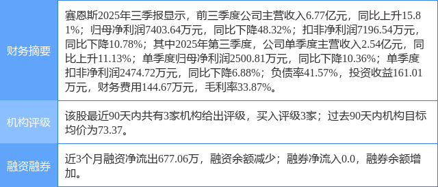 2025年11月1日,东吴证券研究员袁理,谷玥发布了对赛恩斯的研报《2025年三季报点评:业绩受累于费用&减值,拟发行可转债扩产药剂》,该研报对赛恩斯给出“买入”评级。证券之星数据中心根据近三年发布的研报数据计算,该研报作者对此股的盈利预测准确度为81.15%。