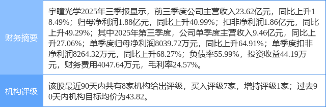 2025年10月29日,国金证券研究员樊志远发布了对宇瞳光学的研报《Q3业绩环比高增,模造玻璃持续放量》,该研报对宇瞳光学给出“买入”评级。研报中预计公司2025-2027年实现归母净利润2.89、4.86、5.81亿元,同比+57%、+68%、+19%,公司现价对应PE估值为40、24、20,维持买入评级。证券之星数据中心根据近三年发布的研报数据计算,该研报作者对此股的盈利预测准确度为43.24%。