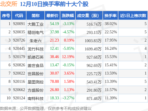 当日北交所换手率前10大个股中5只个股收涨,平均涨幅3.75%,其中大鹏工业(920091)以换手率38.02%排第一,7只个股近5个交易日中多次上榜。