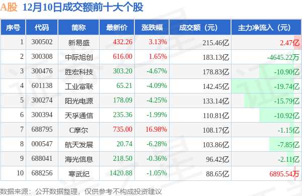 当日A股成交额前10大个股中3只个股收涨,平均涨幅7.25%,其中新易盛(300502)以成交额215.46亿元排第一。从主力资金流入看,成交额前10大个股中有2只个股呈现主力资金净流入。