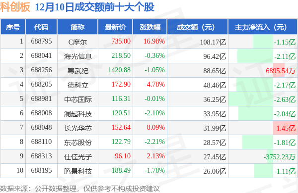 当日科创板成交额前10大个股中4只个股收涨,平均涨幅8.0%,其中C摩尔(688795)以成交额108.17亿元排第一。从主力资金流入看,成交额前10大个股中有2只个股呈现主力资金净流入。